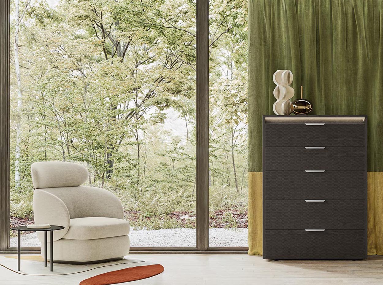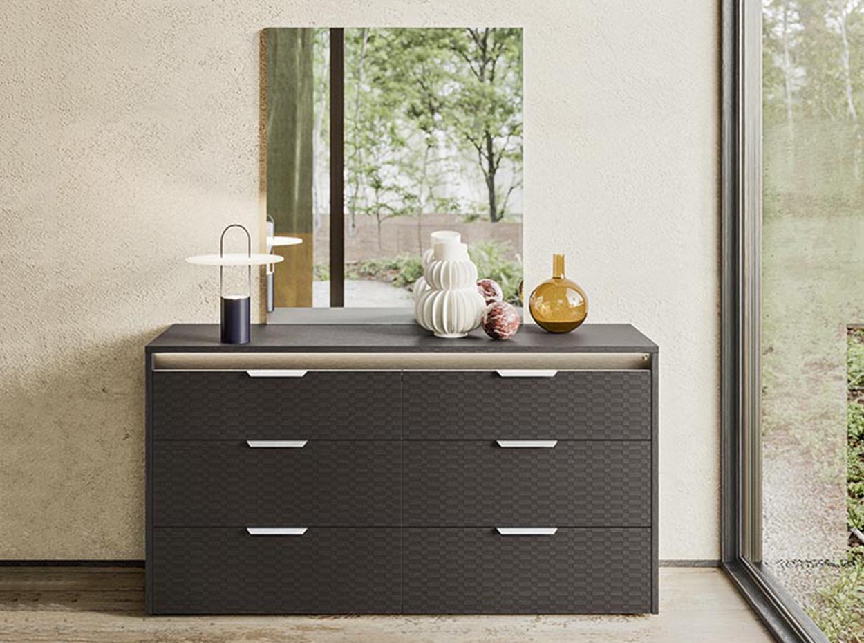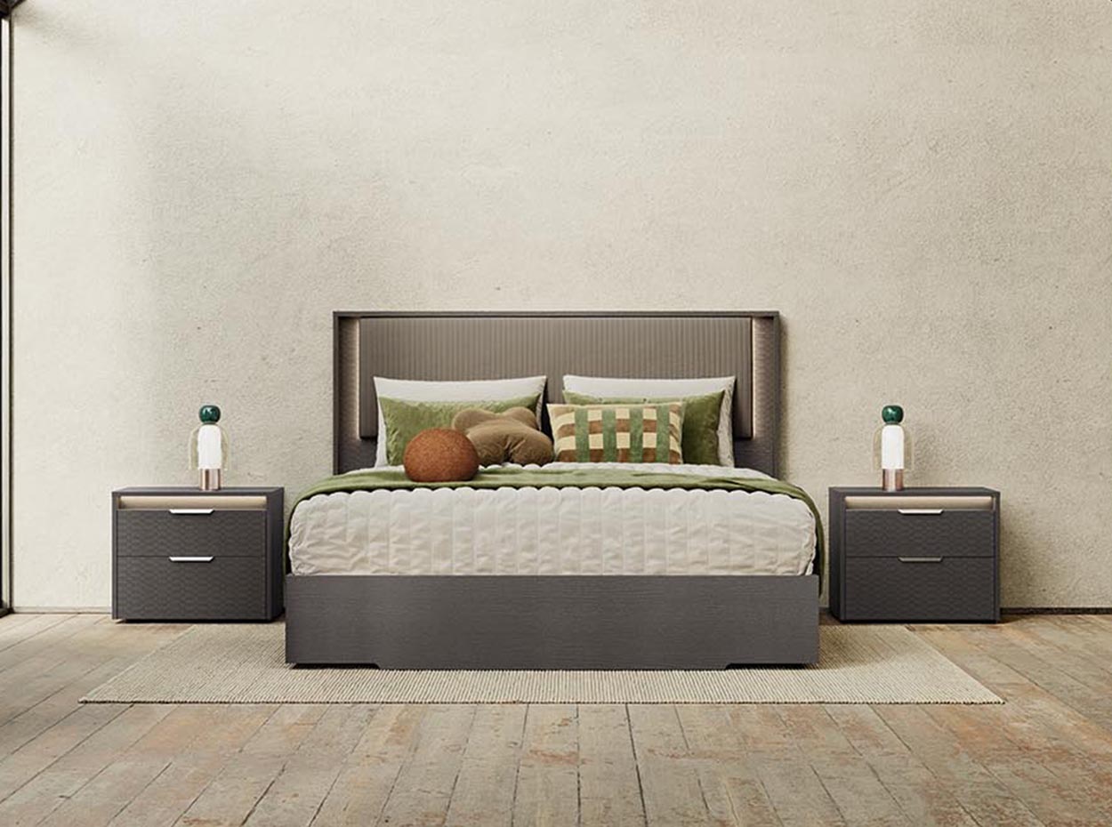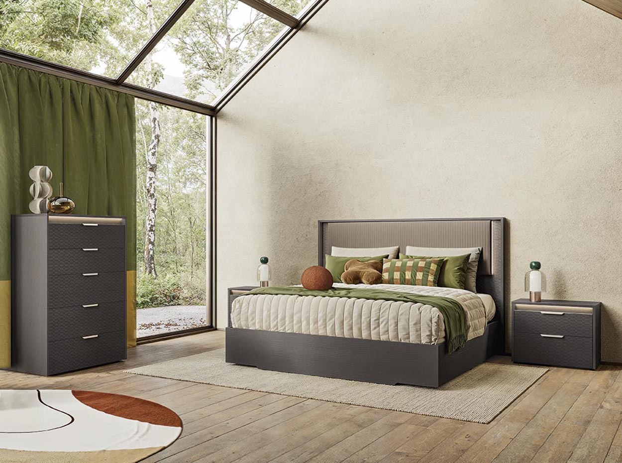 The Amy Bedroom Collection by ALF Italia showcases modern Italian design with a warm Matte Eco Dark Oak finish. The bed features a padded eco-leather headboard with built-in LED lighting for a soft, ambient glow. Optional under-bed storage drawers provide convenient space-saving functionality. Coordinating nightstands include integrated lighting, enhancing both style and nighttime visibility. A matching dresser and chest complete the set, each with optional lighting to elevate the room’s atmosphere.