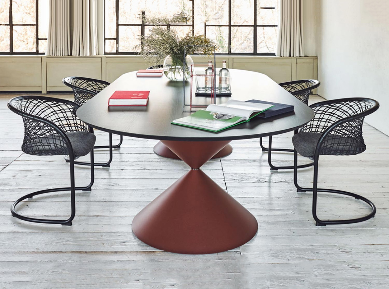 Spacious, sculptural, and undeniably stylish, the Clessidra Double Dining Table by Midj is designed to elevate large contemporary dining spaces. Featuring two hourglass-shaped bases cinched at the center with a metal ring, this table commands attention with its bold symmetry and refined details. The elongated oval top provides generous room for dining, entertaining, or working, making it a multifunctional centerpiece.