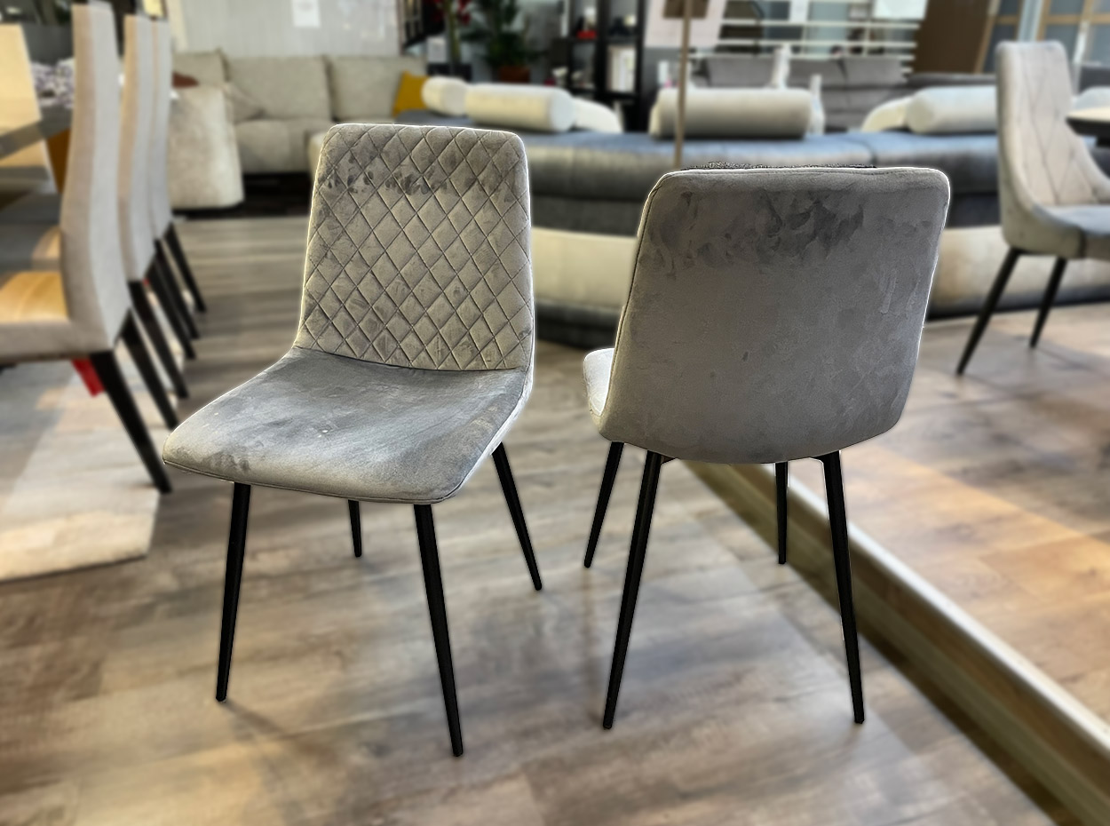Simple, supportive, and stylish, this gray velvet dining chair is a smart choice for modern kitchen and dining spaces. The gently contoured silhouette features a diamond-quilted backrest that’s not overly high, yet offers excellent support for comfortable seating. Upholstered in soft, easy-to-clean velvet, it brings a touch of elegance without compromising on practicality. Black metal legs complete the look with a sleek, sturdy base that complements the chair’s refined design.