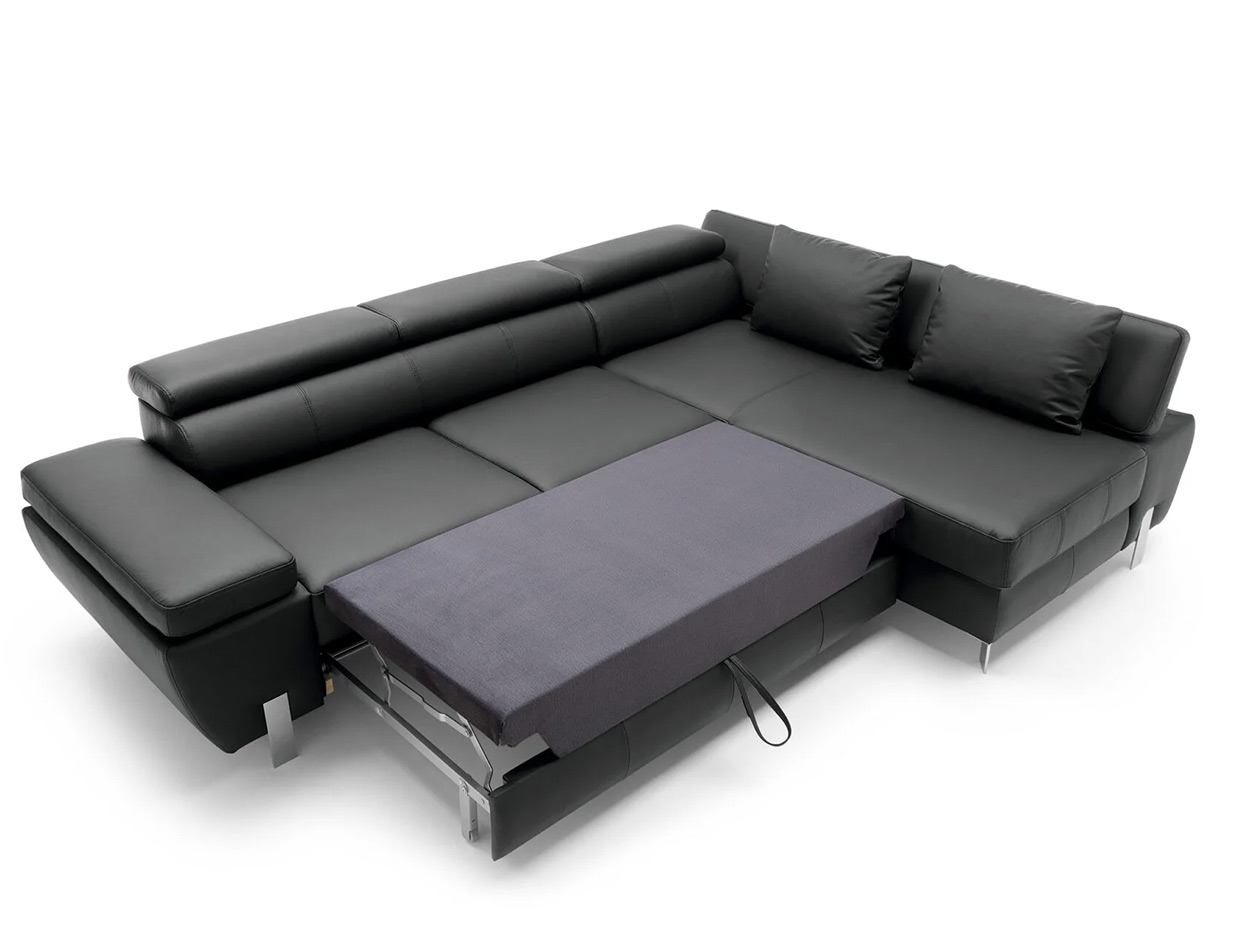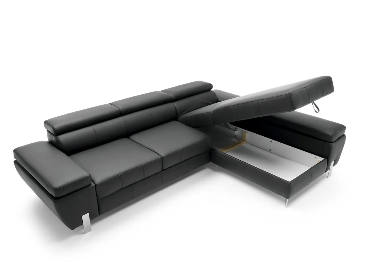 The Molina Leather Mini Corner Storage Sleeper Sofa, crafted from premium natural leather, is the perfect combination of modern elegance, comfort, and functionality. Its sleek metal legs emphasize a contemporary design, while adjustable headrests, movable armrests, and supportive backrests provide a customizable relaxation experience. Designed for versatility, it features a practical sleeping function, effortlessly converting into a cozy bed. A spacious storage compartment, discreetly hidden in the ottoman, offers convenient space for bedding and essentials. With its luxurious natural leather upholstery, the Molina sofa enhances any living space with sophisticated style and everyday practicality.