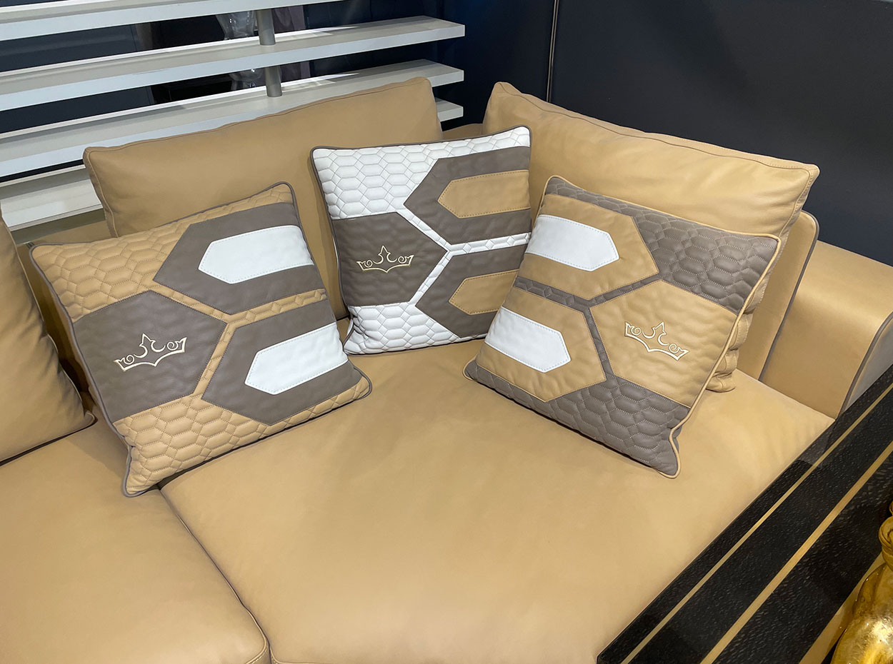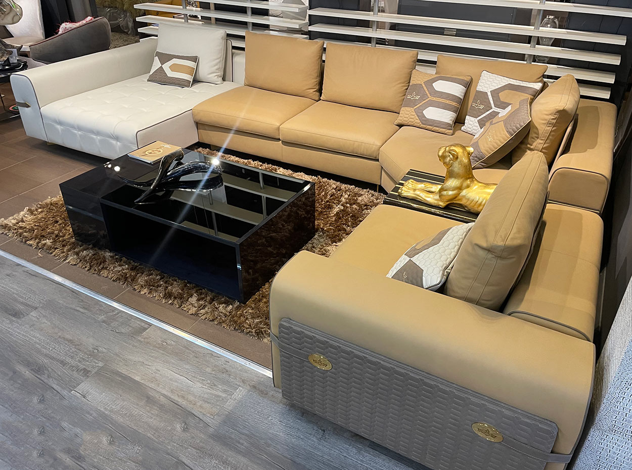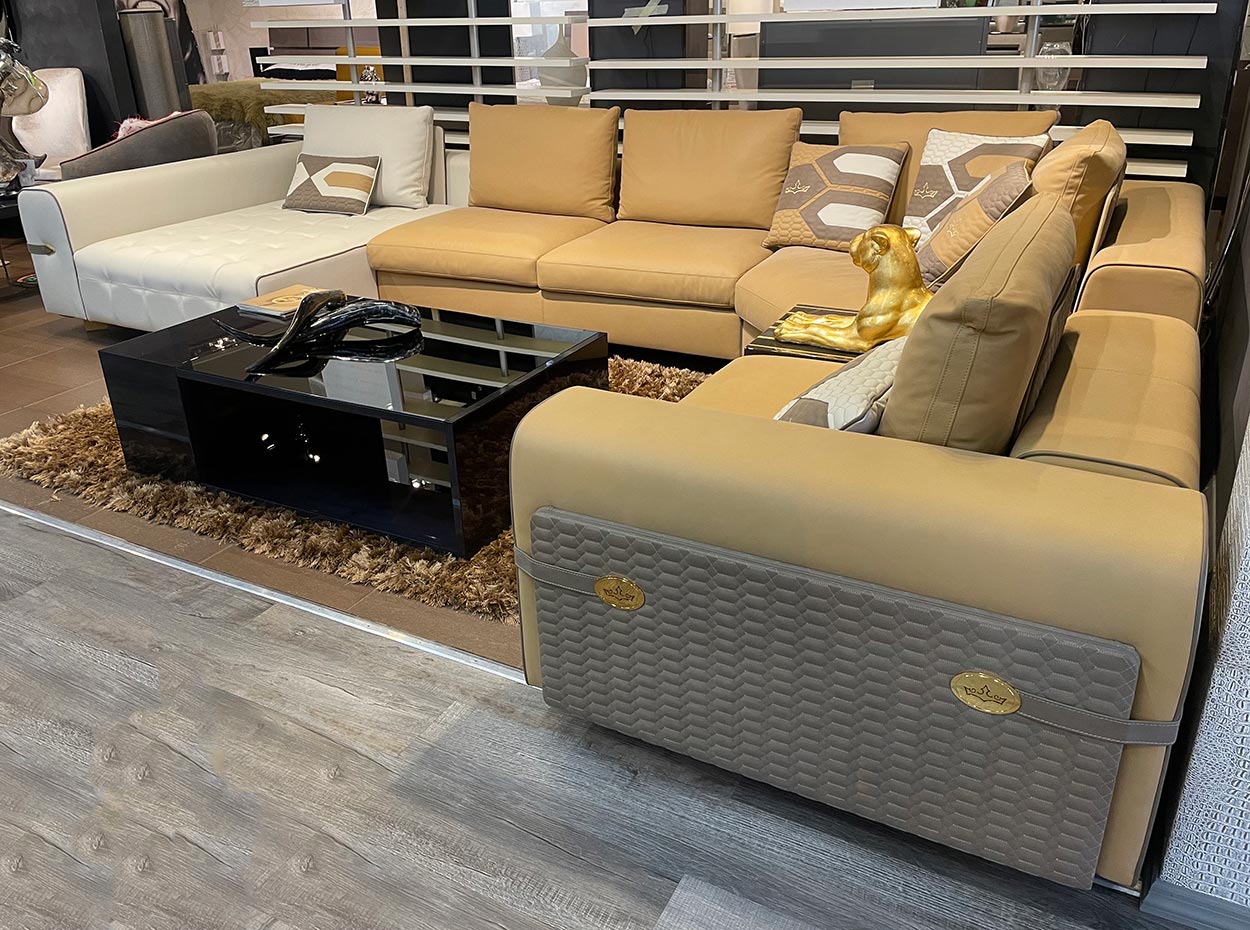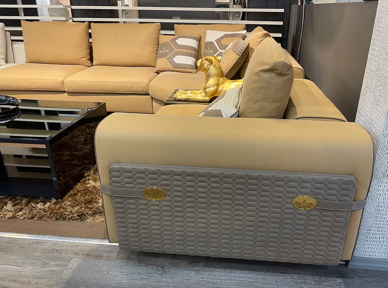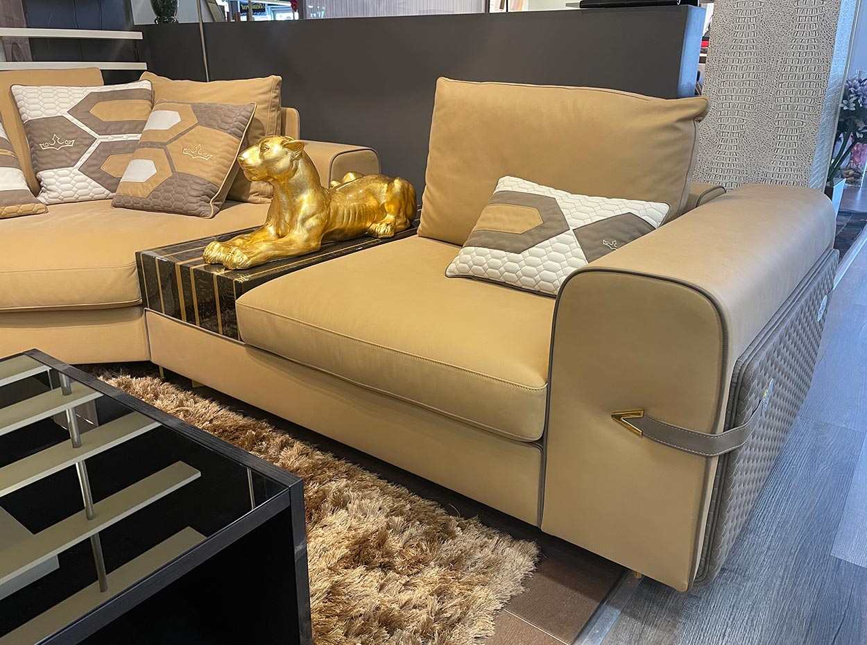 The Richmond Italian Sectional Sofa by Formenti is a true statement piece, embodying the finest in luxury design and craftsmanship. Made in Italy from genuine leather, this U-shaped sectional offers generous seating and impeccable comfort. Designer decorative pillows are included, adding texture and refinement, while intricate stitching and bold gold-finish accents lend a touch of opulence. A built-in end table in rich zebrano wood provides a practical and stylish surface, seamlessly integrated into the sofa’s elegant form. Perfect for sophisticated interiors, the Richmond Sofa blends timeless design with modern luxury, making it the centerpiece of any living space.