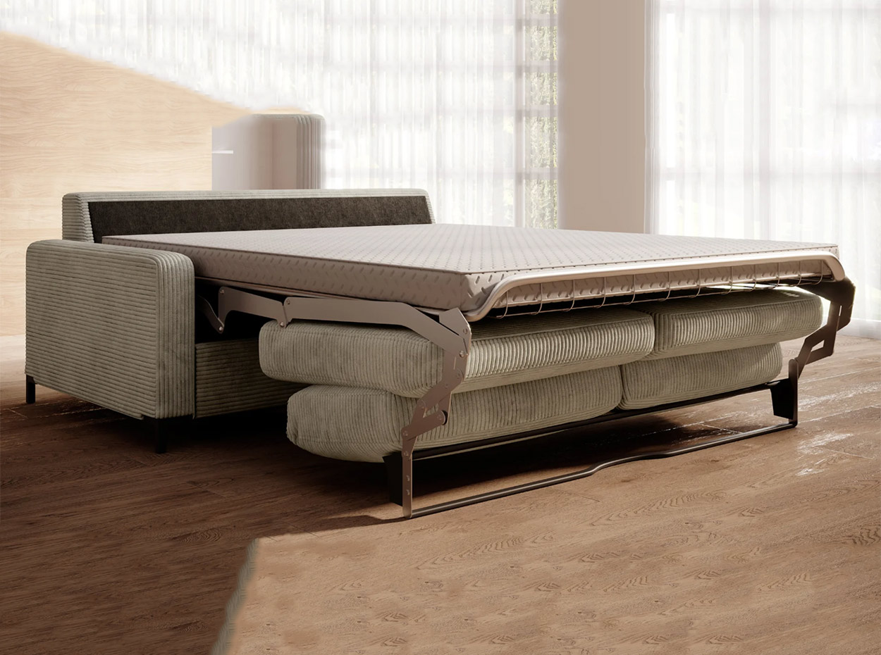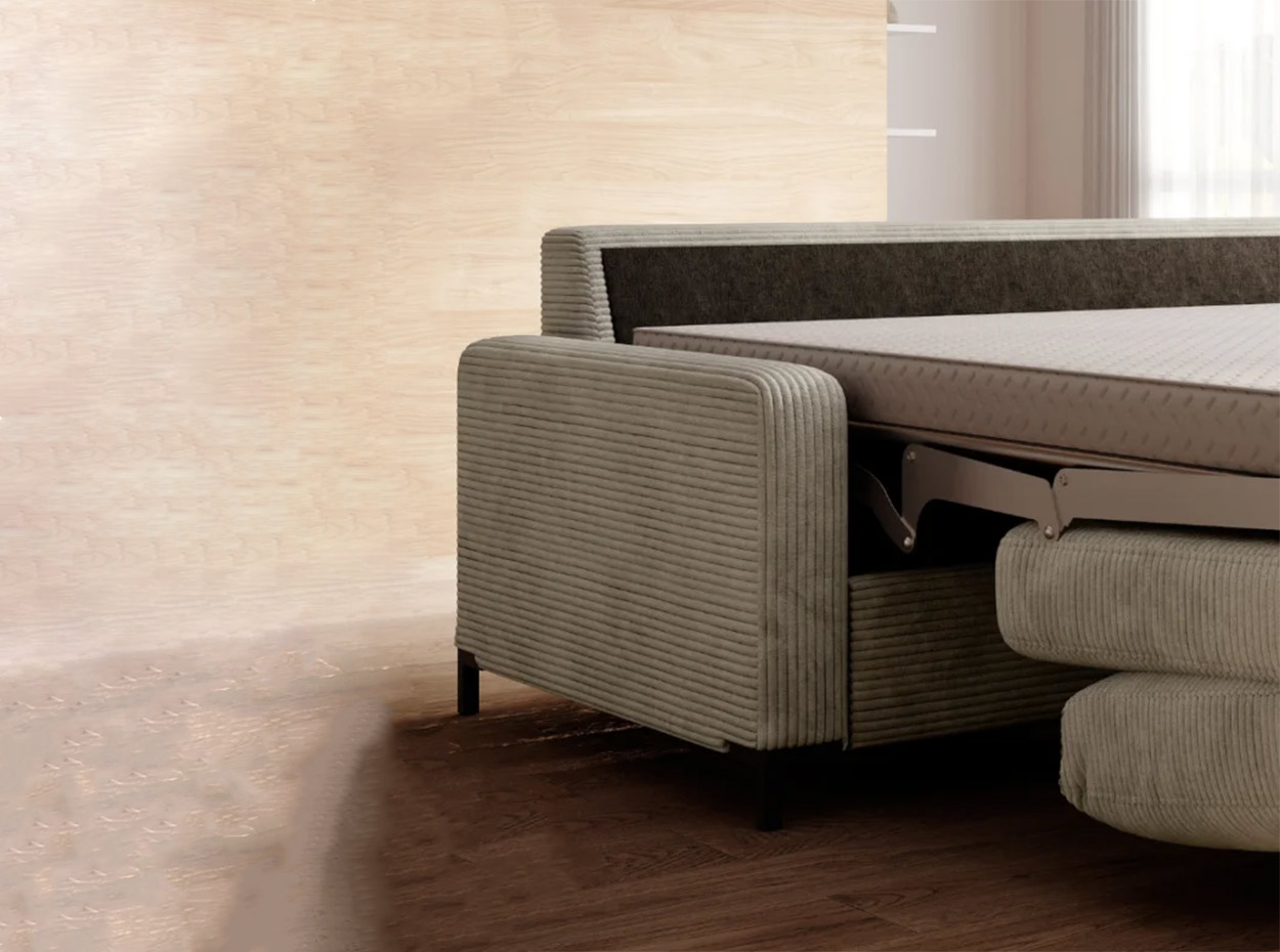 The Tino Sleeper Sofa Bed is a model with a delicate yet striking design, offering versatility with a choice of three width sizes to perfectly suit both spacious and smaller interiors. Equipped with an Italian folding system, it effortlessly transforms into a comfortable bed thanks to a discreetly hidden mattress. This blend of elegant aesthetics and practical functionality makes the Tino Sleeper Sofa Bed an ideal solution for those seeking style and comfort in modern living spaces.