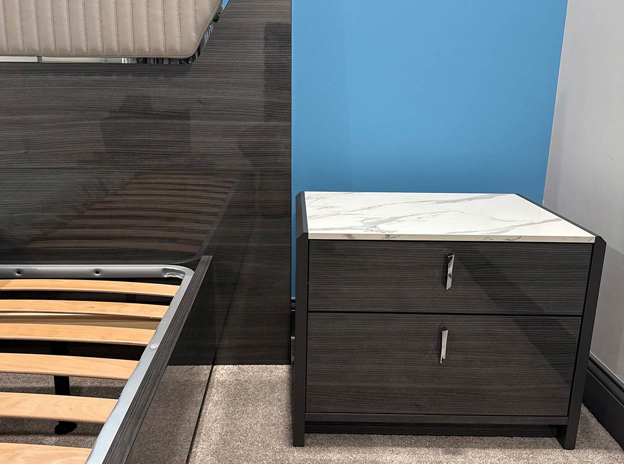 Vulcano Modern Bedroom Furniture by Tomasella. Experience the meticulous craftsmanship and striking color contrasts of the newly introduced Vulcano bed by Tomasella Class, Italy. The finish is Luxurious grey oak with a high gloss. The bedroom collection offers a nightstand, dresser, and chest with white marble effect tops to complement your interior and provide ample storage space.